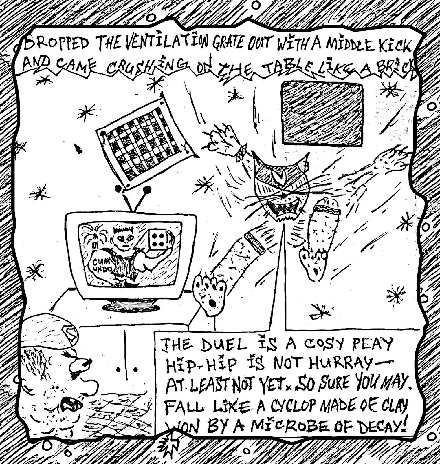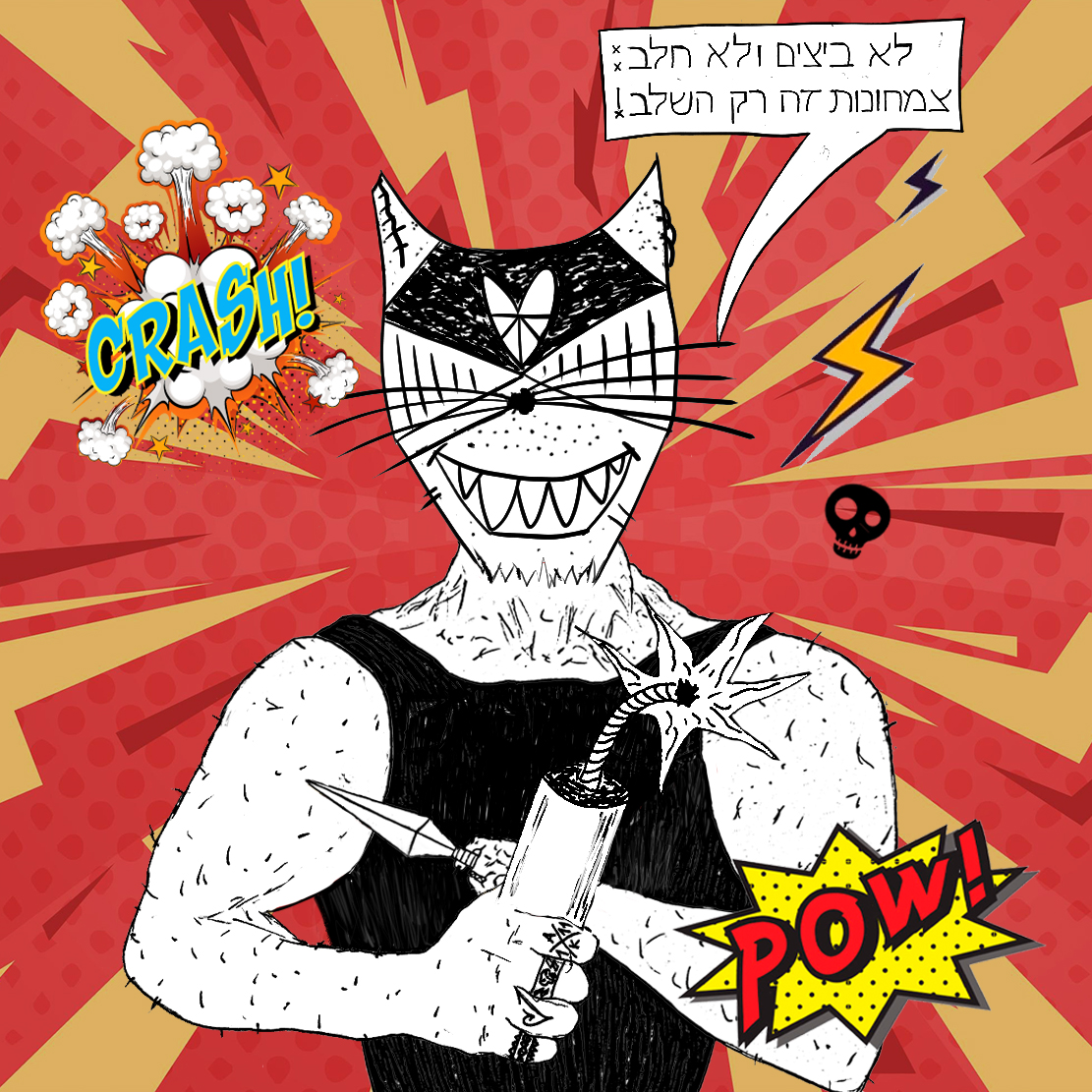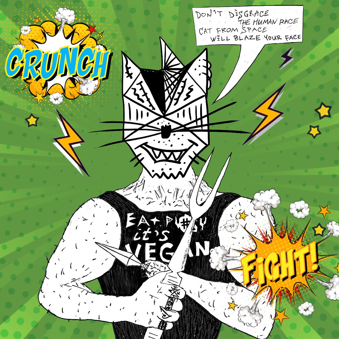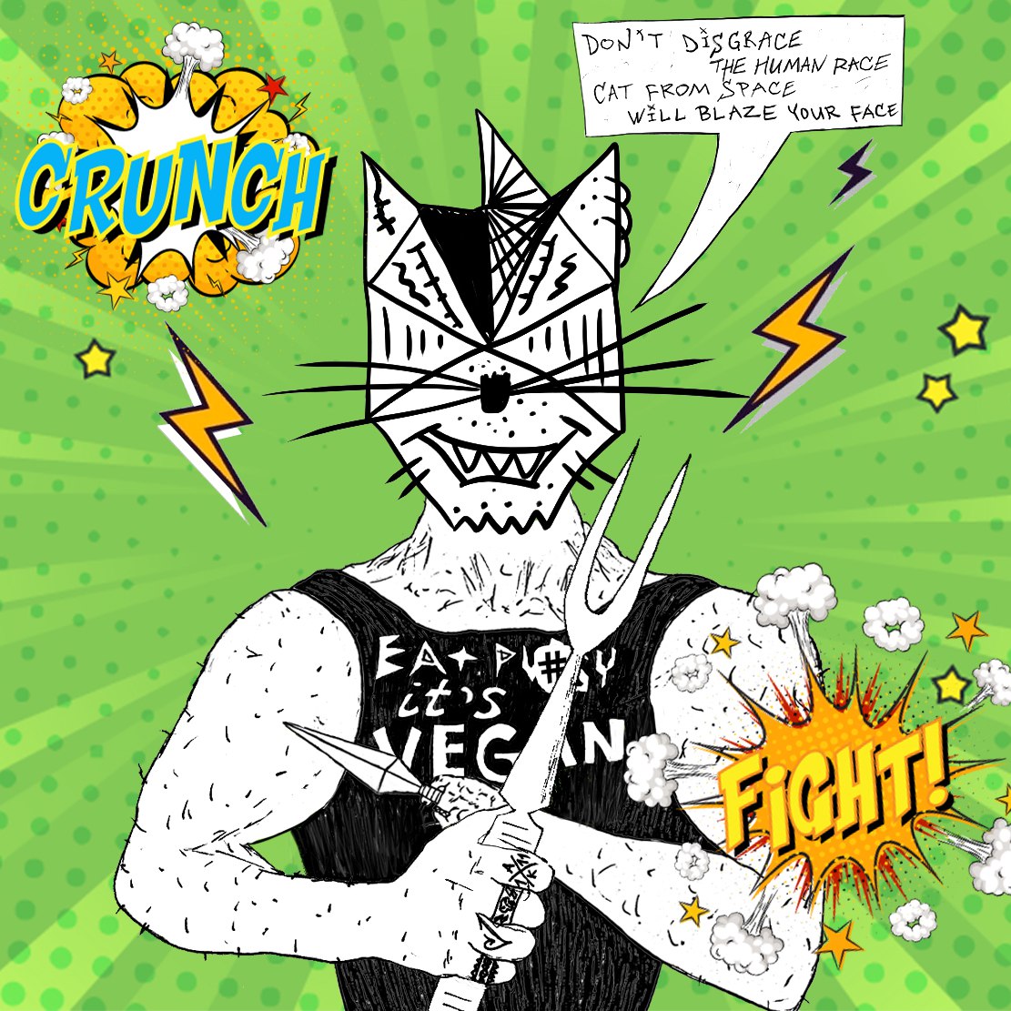 The collection is inspired by the plot of the comic strip "VitaminKa landed. It’s F#&%d Up" — a 96-page, black-and-white, rhymed story of a tainted alien supercat, the first part of the Vitamin_Ka tetralogy. The English version of the comic strip will be released in 2022.